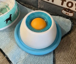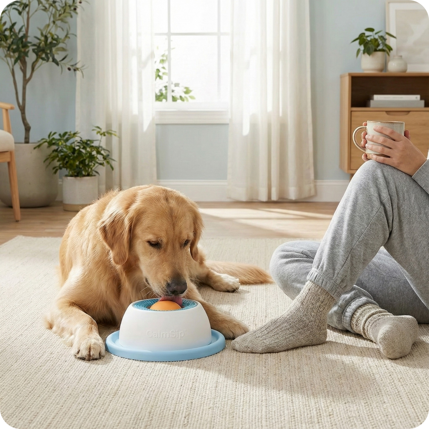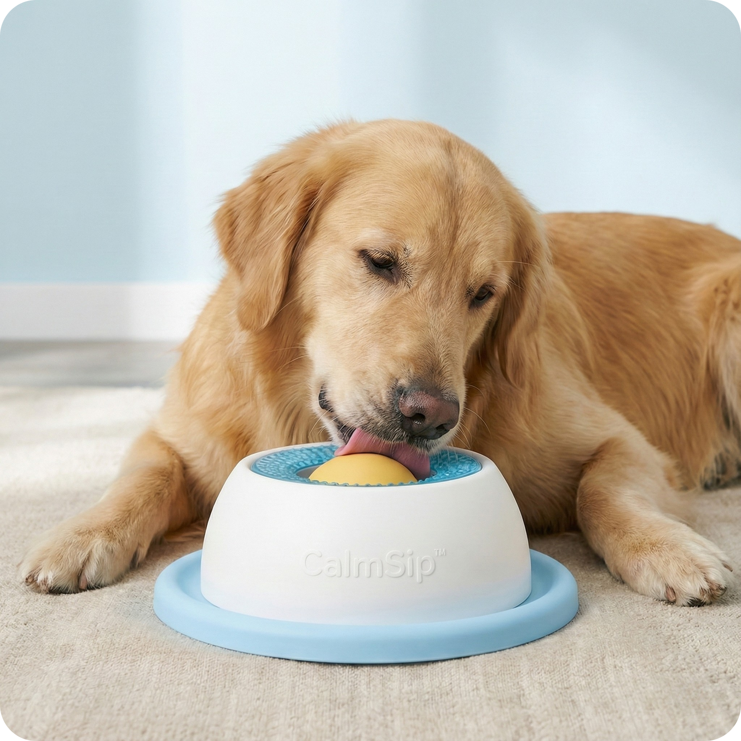 CalmSip™ is a slow-lick treat bowl designed to help dogs stay calm while enjoying soft treats. The rolling ball releases food gradually as your dog licks, encouraging slower, more focused behavior and less mess.